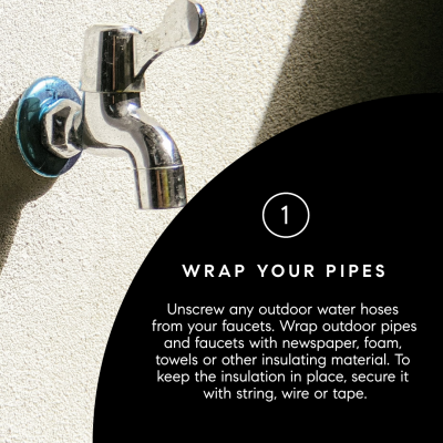 Outdoor faucets and exposed pipes are especially vulnerable to freezing during cold weather. Be sure to remove hoses and insulate exterior pipes to help prevent freezing and potential bursts. A little insulation now can save significant repairs later. Order your hose bib covers here.